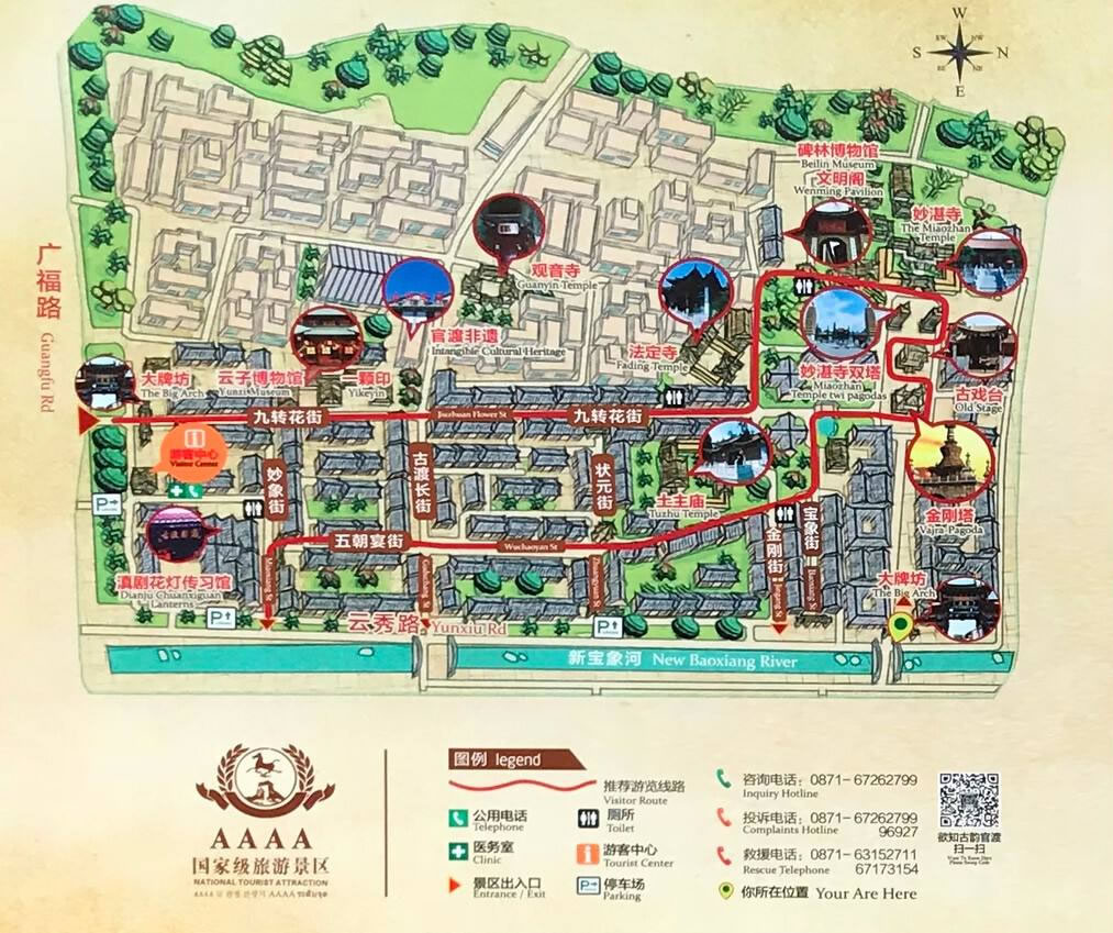 至今賜書堂猶存。到了清代,官渡古鎮(zhèn)在今螺峰、秀英、西莊和尚義4個村子的范圍內已形成洋溢著濃濃文化色彩“六寺七閣八廟”的建筑群。這些壯觀的建筑與自然風光相融合,構成了一幅優(yōu)美的畫圖,形成了所謂官渡八景,即“古渡漁燈”、“螺峰疊翠”、“云臺月照”、“杏圃牧羊”、“凌云煙繚”、“滇南草坪”、“金剛夜語”和“筆寫蒼穹”。