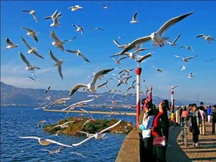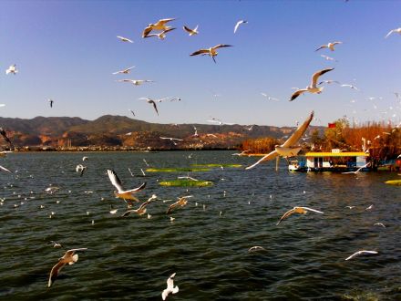 滇池位于昆明市南的西山腳下,其北端緊鄰昆明市大觀公園,南端至?xí)x寧縣內(nèi),距市區(qū)5km,歷史上這里一直是度假觀光和避暑的勝地。滇池形似弦月,南北長(zhǎng)39km,東西寬13.5km,平均寬度約8km。湖岸線長(zhǎng)約200km;湖面面積300k㎡,居云南省首位,湖水最大深度8m,平均深度5m,蓄水量15.7億,素稱“五百里滇池”。是中國第六大內(nèi)陸淡水湖。