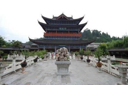 山頂建造的五星古典式全木結構望景樓,名“萬古樓”。樓高32.8米,16根24米長的木柱一柱通頂,樓上有大小12600個納西風格的龍頭,創(chuàng)下世界之最。