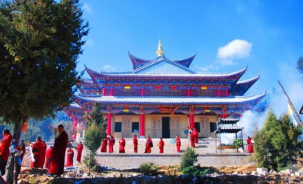 普濟寺位于麗江古城西北6千米的普濟山中,始建于清乾隆三十六年(1771年),為麗江城郊五大喇嘛寺之一,因大殿鋪蓋銅瓦面而聞名遐邇。大殿院落由山門、護法堂(門樓)、正殿、南北廂房組成四合院。正殿平面是長方形,初用土瓦覆蓋,由圣露活佛輾轉西南各地講經(jīng)、集資,于1936年改覆銅瓦,面積為46.4平方米。