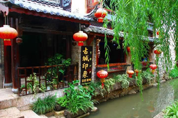 以水為核心的麗江古城因水的活用而呈現(xiàn)特有的水巷空間布局。橋梁密集是麗江古城最大的特色。在外部造型與結構上,古城民居揉合了中原漢族建筑和藏族、白族建筑的技藝,形成了向上收分土石墻、迭落式屋頂、小青瓦、木構架等建筑手法,在建筑布局形式、建筑藝術手法等方面形成了獨特的風格。民居大多為土木結構,比較常見的形式有以下幾種:三坊一照壁、四合五天井、前后院、一進兩院等幾種形式。