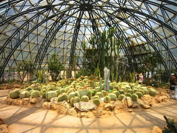 大溫室設(shè)計體現(xiàn)了鮮明的時代氣息。共分為四個展區(qū),分別是熱帶植物展區(qū)、溫帶植物展區(qū)、高寒植物展區(qū)(海拔3000米以上的植物)和圖片展覽館。三個植物展區(qū)由小到大,高度依次增加,屋面坡度也依次加大,形成一種螺旋上升的態(tài)勢,暗喻人與自然和諧共存的辯證規(guī)律。立面采用高差變化處理、分段布置,寒帶展區(qū)8─12米高、溫帶展區(qū)10─16米高、熱帶展區(qū)10─20米高,打破了建筑形狀的單調(diào)感。根據(jù)三種氣候帶植物生長環(huán)境及生態(tài)要求,各展區(qū)及內(nèi)部空間高低變化、斜屋面的設(shè)置,適宜于植物的合理布局和生態(tài)空間的需要。參觀者既可從室外隔著玻璃觀光,又可進(jìn)入室內(nèi)與展示環(huán)境充分融合,從不同的角度享受匠心巧作的自然風(fēng)光。