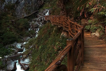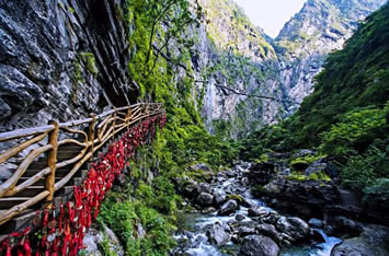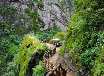 ②高空棧道探險游路:福緣橋——龍王廟——天開石門——鶴峰亭——五道水服務區(qū)——高空玻璃棧道——七彩玻璃觀景平臺——高空棧道——七道水彩虹橋——七道水瀑布——野生芭蕉林——百步天梯——萬獸谷——枯木要塞。全長3500米,