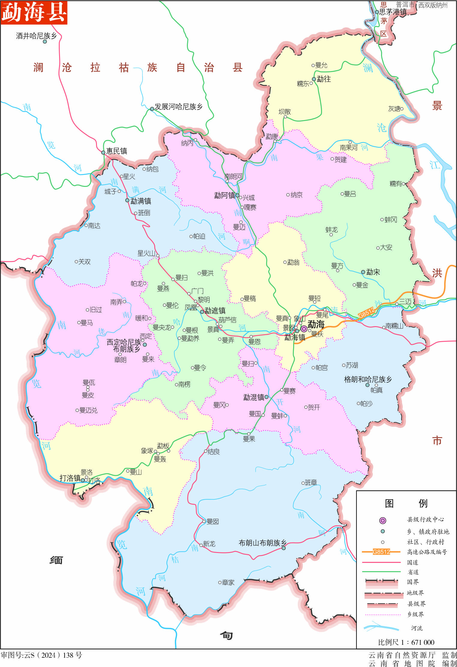 鎮(zhèn):勐海鎮(zhèn)、打洛鎮(zhèn)、勐遮鎮(zhèn)、勐混鎮(zhèn)、勐滿(mǎn)鎮(zhèn)、勐阿鎮(zhèn)