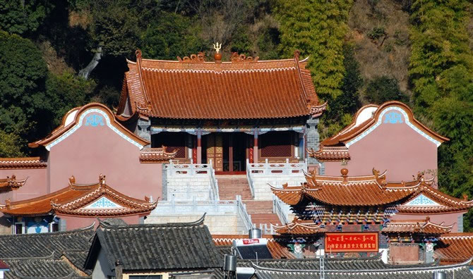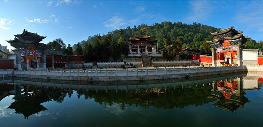 始建于元末,歷經(jīng)明清歷代重建重修,現(xiàn)為清初和清末的建筑。寺中保存下一堂(六扇)木雕槅門(mén),出自清末滇南木雕藝術(shù)家高應(yīng)美之手,槅子門(mén)中的構(gòu)圖、布局、人物造型,被省內(nèi)外學(xué)者稱之為“海內(nèi)第一木雕”。三圣宮布局為三進(jìn)式兩院,由大殿、后東西兩廂、中殿、前東西兩廂、前殿(重檐)及前、中、后的六個(gè)躲間組成,外設(shè)圍墻并呈船形,墻外雙溪環(huán)繞而過(guò)。1993年被省政府公布為“第四批文物保護(hù)單位”。