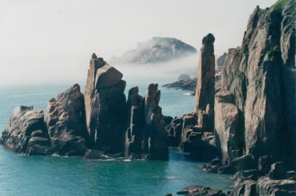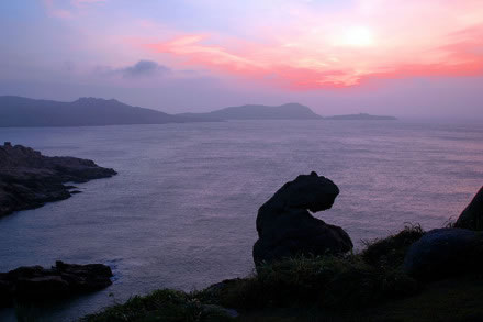 慈航普渡的觀世音菩薩在南麂列島定格、凝固成了高20米的天然巨像,它身披風(fēng)帔(俗稱“觀音兜”),垂著兩袖,眉目宛然,專注地向東海第面凝視。然而這觀音巖腳下全是刀劍般的礁石,潮來時(shí)淹滿水,更像是泥犁地獄了。而在不遠(yuǎn)的1.5米外,有5支石柱聳立,其中最高的柱頂,酷似調(diào)皮搗亂和小猴子。它在觀音菩薩面前,有所窺伺,又有所祈求。更令人驚奇的是,景隨步移,若南行數(shù)十步,從另一個(gè)角度望,慈目的妙齡觀音卻突然變成了老態(tài)龍鐘的南極仙翁,故人們又稱之“壽星巖”。移步換形不僅平尜游人興趣,而且從“雙面人”身上也不有同感悟。