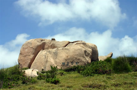 天然草坪西側(cè)山上,有一巨崖,橫臥地上,像一頭俯伏的雄獅、從北看,又似伸長(zhǎng)鼻子的大象。東側(cè)山上巖群中,還有一只大象的頭、長(zhǎng)鼻子向下延伸,一雙眼睛向游客凝視。鄰近石像一頭海龜,翹首藍(lán)天,似在仰望著翱翔的鷗鳥。