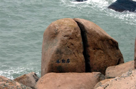 能以人力或風(fēng)力推動(dòng)而搖擺的大巖石,在各地勻有發(fā)現(xiàn)。南麂三盤尾石門旁的風(fēng)動(dòng)巖卻別有情趣。此石高約5.5米,直徑4米,形如銅鼓,卻裂成兩瓣,一瓣是“靜如處子”分外端莊;另一瓣,凡遇上5級(jí)以上大風(fēng),便自行搖動(dòng),可謂“動(dòng)似脫兔”,還以發(fā)出悅耳聲響,宛如海底傳來的進(jìn)軍號(hào)角。倘若無風(fēng)時(shí),那只得勞駕游客,憑力氣去推、去搖。面對(duì)風(fēng)動(dòng)巖了,聯(lián)想起佛教中關(guān)于“風(fēng)動(dòng)也,情動(dòng)也,見仁者自己心動(dòng)”的“因緣和合”典故,似乎明白了自然景觀中也充滿生活哲理。此巖其自身根基不穩(wěn),加上風(fēng)的外力,便顯得搖擺不定。