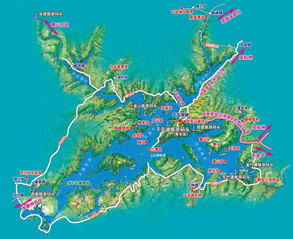 千島湖與桐廬瑤林仙境、嚴子陵釣臺,建德大慈巖,蘭溪諸葛八卦村,龍游石窟,安徽西遞、宏村等景點聯(lián)成一體,體,吸引眾多的游客。千島湖所在的淳安縣北接臨安縣、南接常山縣、西南與開化縣、衢州市為鄰,東南與桐廬和建德二縣市接壤,西北與安徽省交界。